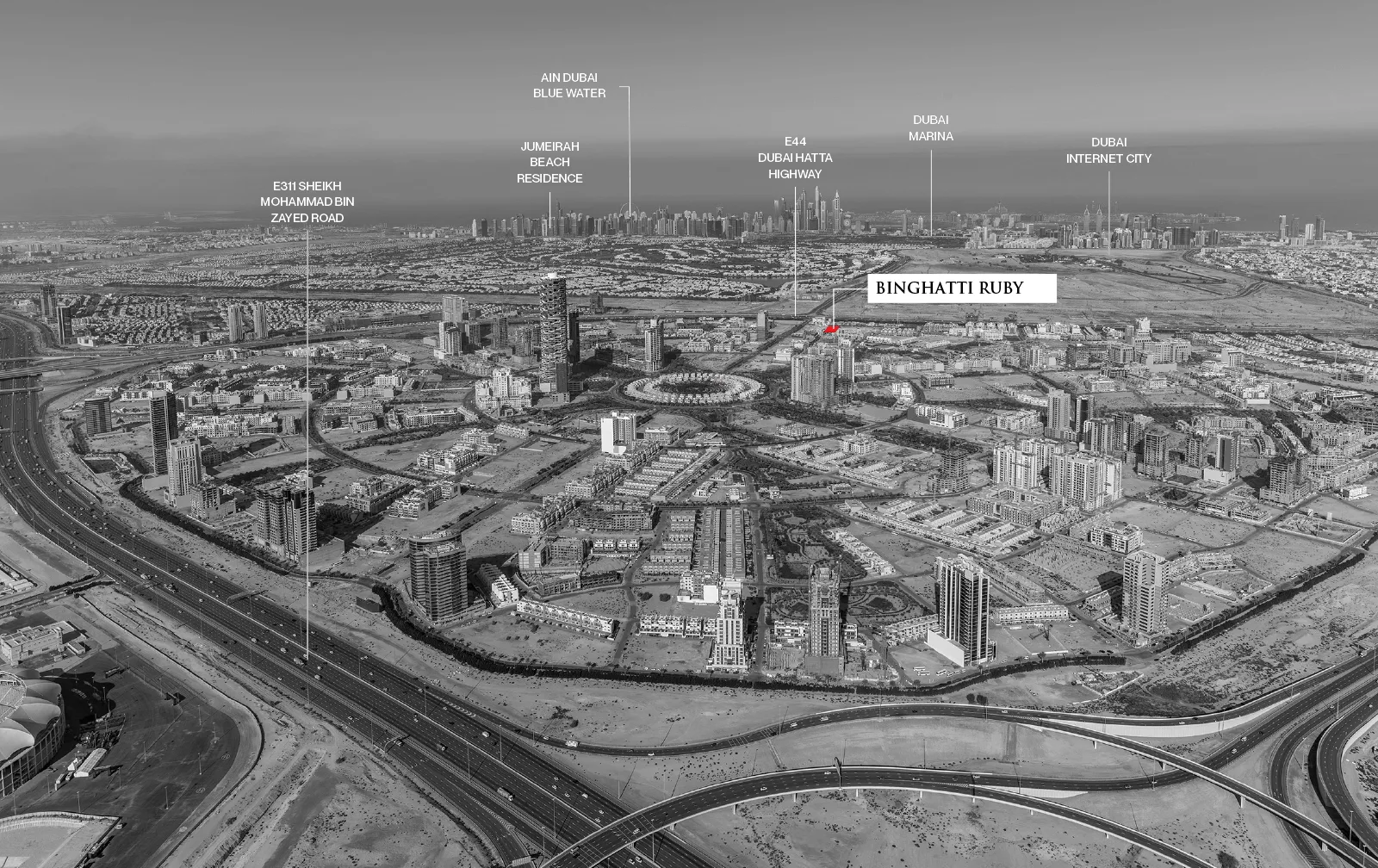 Binghatti Ruby at JVC is the latest residential addition, developed by the Binghatti Developers, featuring luxury studios, 1, 2 and 3-bedroom apartments laced with modern facilities. The elegant high-rise façade is lined with basement, ground, four leisure podium levels and two office floors as well as 18 residential luxuries along with the rooftop leisure, inspired by the opulent ruby gemstone that showcases elegance and innovation in the heart of Dubai. The building’s architecture stands out, with its avant-garde design reflecting the signature style. Each residence is crafted to offer an unparalleled living experience with high-quality finishes and modern interiors. With stunning views of the city skyline, the façade provides a luxurious urban lifestyle for residents seeking both comfort and sophistication.