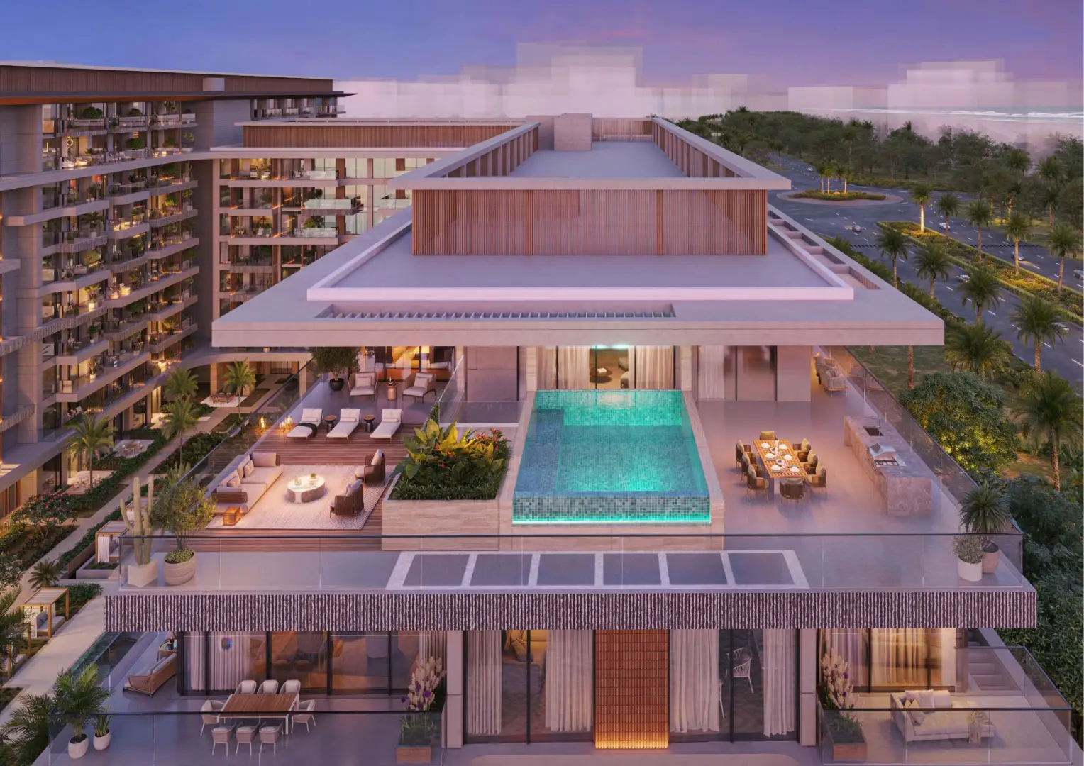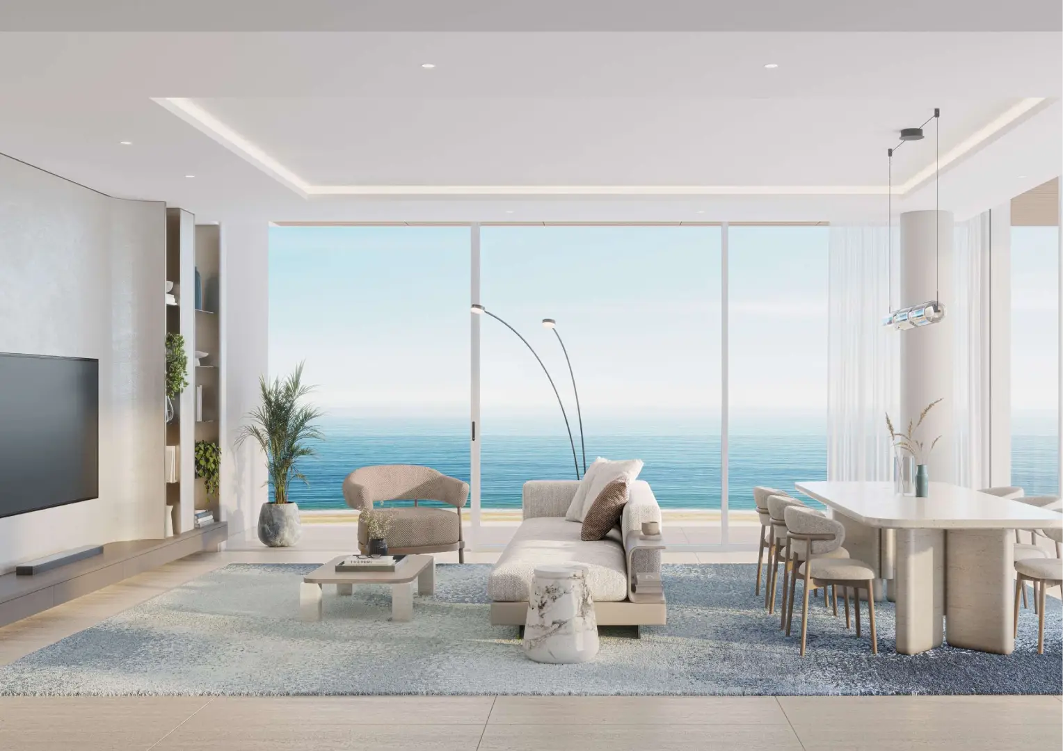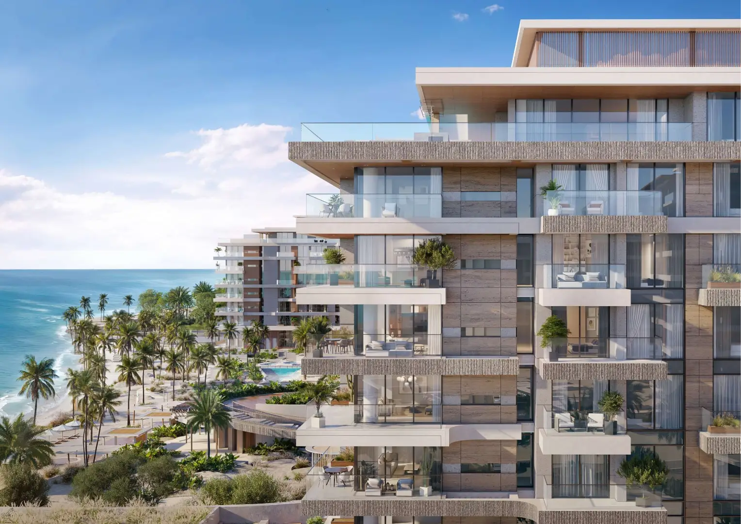 Configuring a wide range of homes, the interiors are not just grand but also inviting and crafted with open layouts. The generous living room features a furnished seating zone, a dining zone, and an open kitchen with extra storage. Relax or hold family gatherings in a spacious setting which is illuminated throughout the day by sunlight and enjoy panoramic views of the gleaming sands and the ocean.
