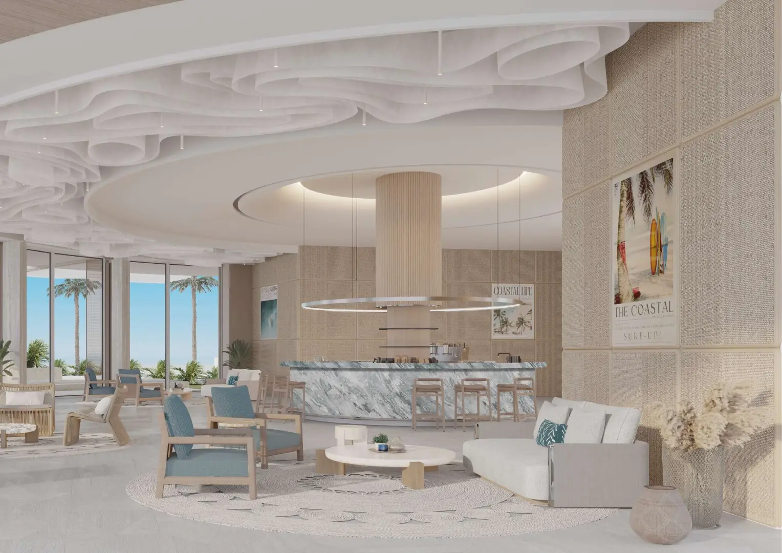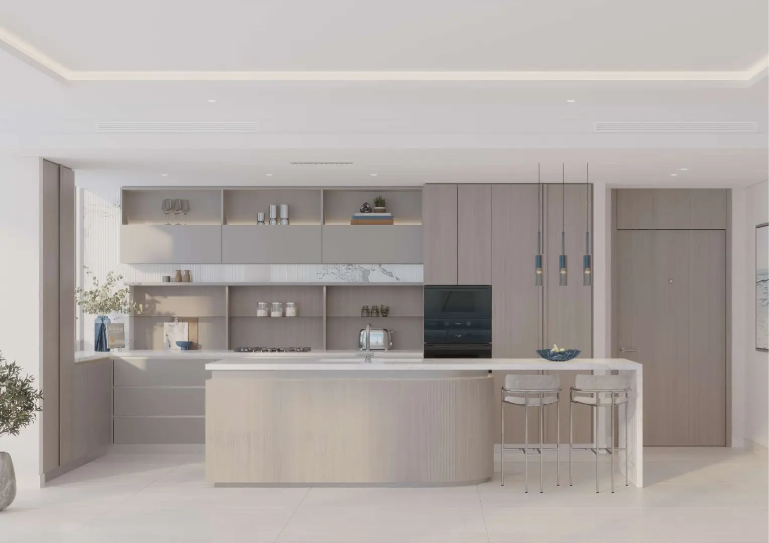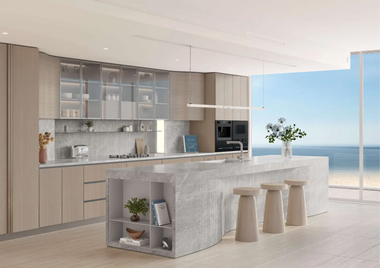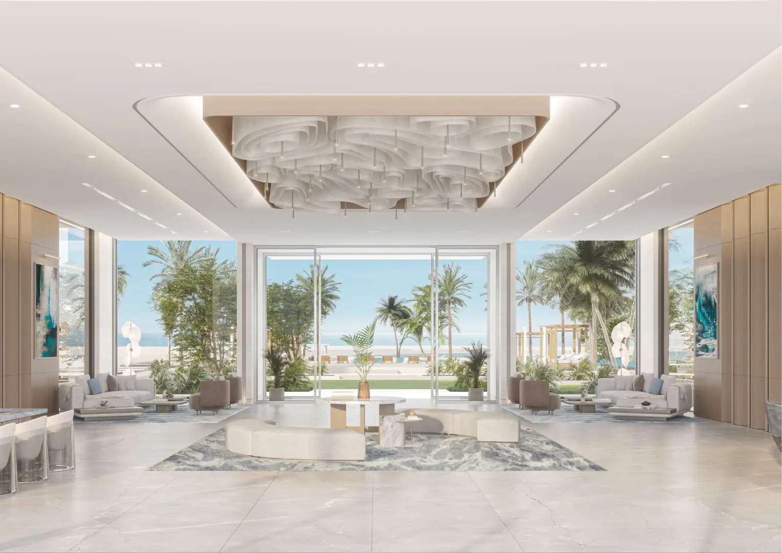 Configuring a wide range of homes, the interiors are not just grand but also inviting and crafted with open layouts. The generous living room features a furnished seating zone, a dining zone, and an open kitchen with extra storage. Relax or hold family gatherings in a spacious setting which is illuminated throughout the day by sunlight and enjoy panoramic views of the gleaming sands and the ocean.